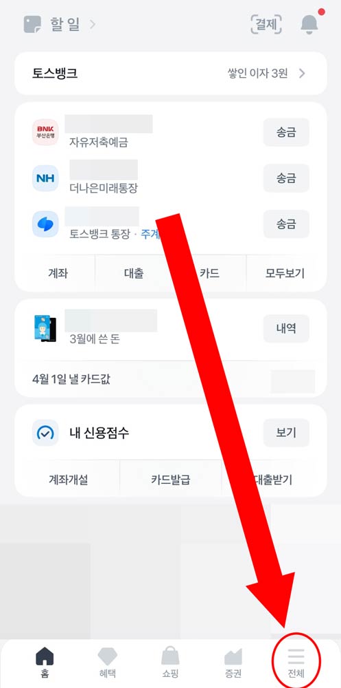 - 토스 앱 하단 전체 메뉴 클릭