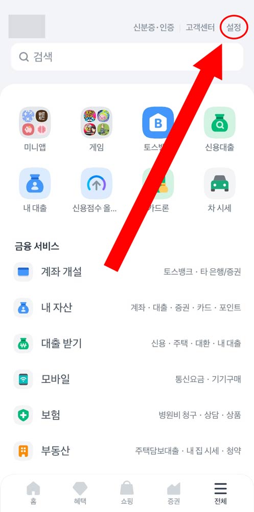 전체 메뉴 화면으로 이동하면 오른쪽 상단에 설정 버튼이 있습니다. 이곳에서 토스 앱의 언어, 알림, 화면 설정 등을 변경할 수 있습니다. 설정 버튼을 클릭해주세요.