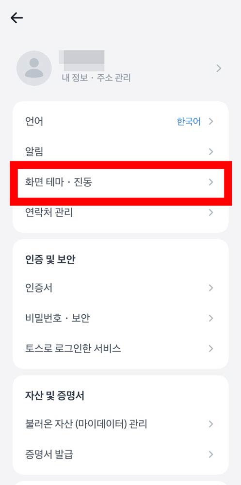 설정 화면에 들어가면 여러 항목이 나오는데 여기서 화면 테마 · 진동 메뉴를 선택합니다. 이 메뉴 안에서 토스 밝은 화면 모드와 토스 어두운 화면 모드를 설정할 수 있습니다.