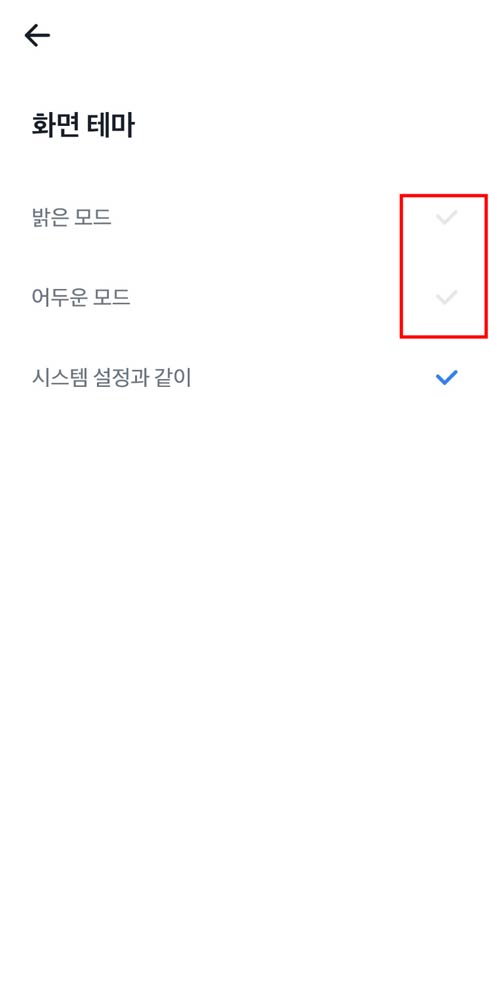 - 화면 테마에서 밝은 모드 또는 어두운 모드 선택